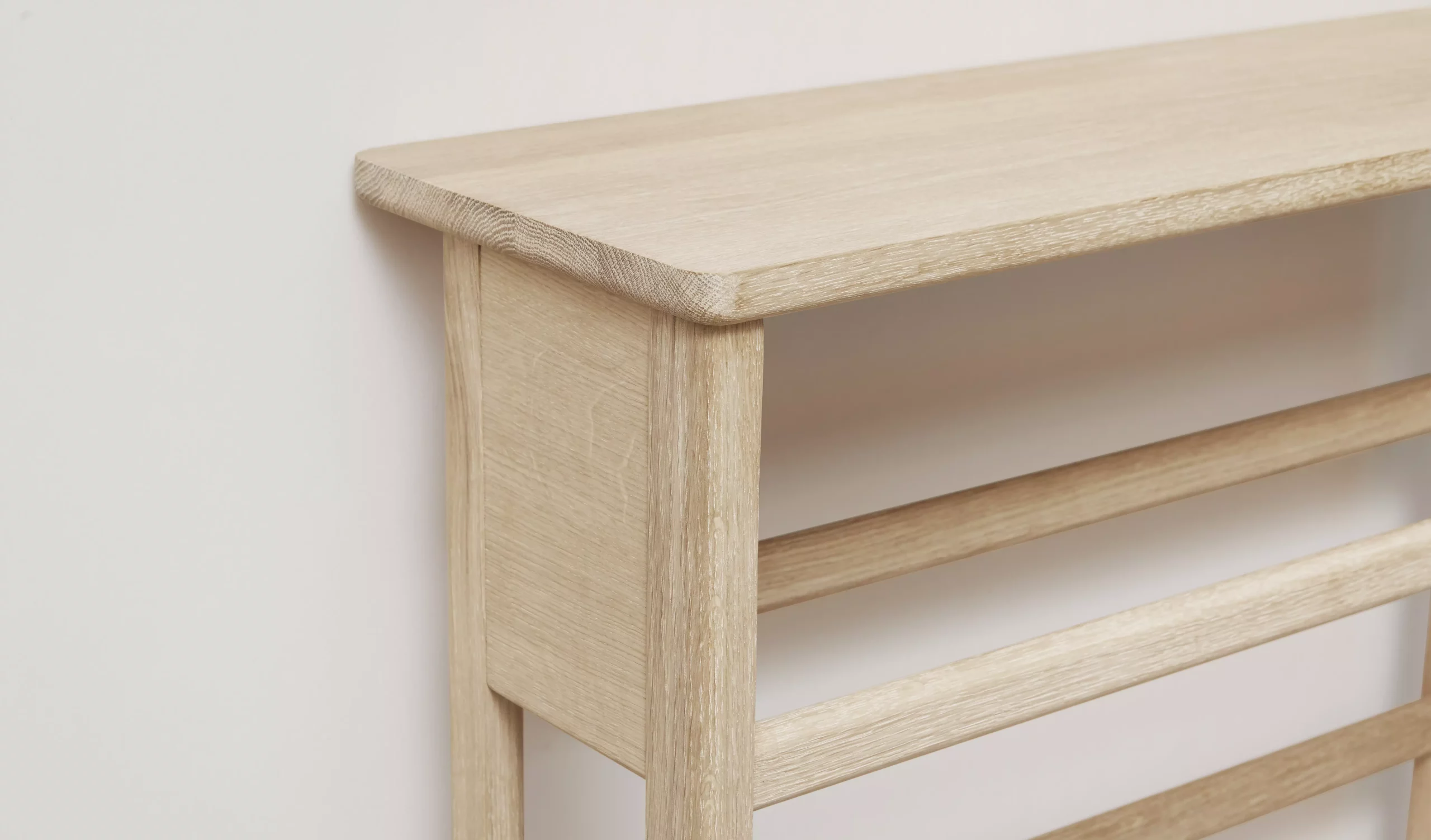 Das A Line Shoe Rack in harmonischem Design ist eine Kombination aus Schuhregal und Ablage für schmale Flure, den Haushaltsraum oder den abgetrennten Eingangsbereich. Das Regal ist aus nachhaltiger Eiche von höchster Qualität. Die Kanten sind fachmännisch abgerundet, und die etwas größere Fläche oben am Schuhregal dient als Ablage.