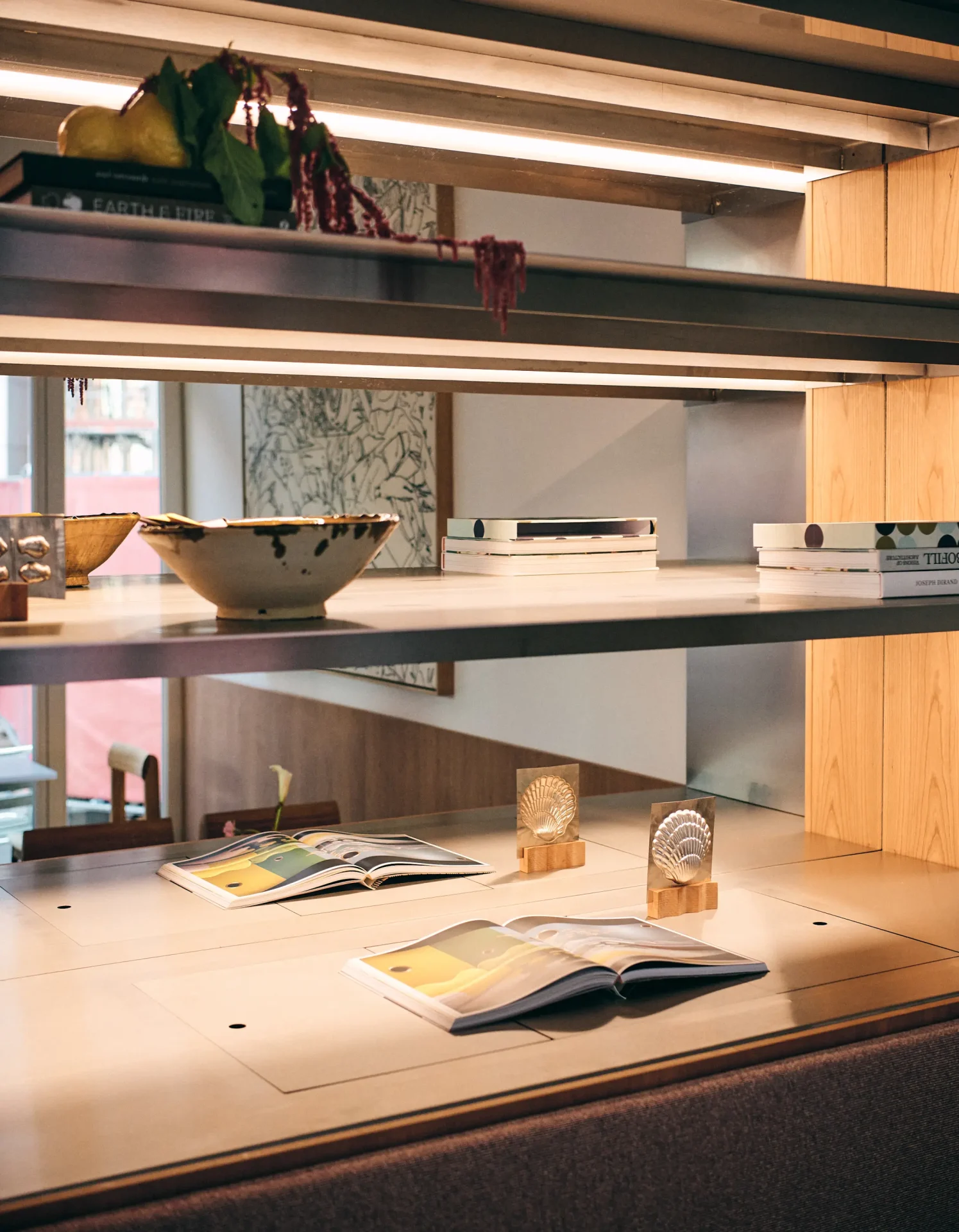 Wood-fired terracotta tiles and hand-blown Murano glass lamps reflect a strong sense of craft, while cherry wood and a sculptural rose marble bar add warmth and character. The Form & Refine Blueprint Chairs introduce a quiet contemporary presence that balances tradition with modern expression.