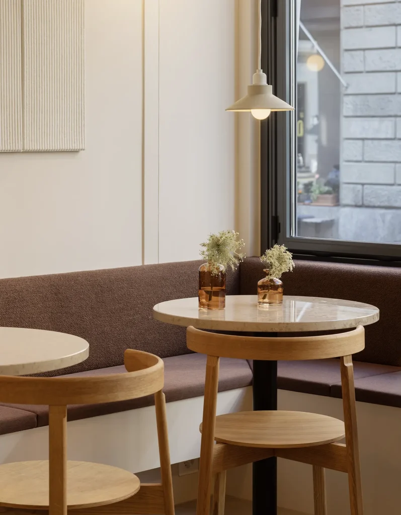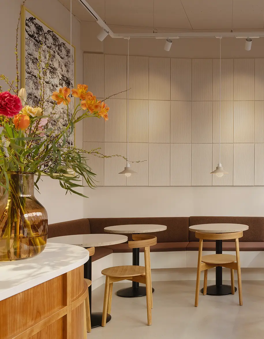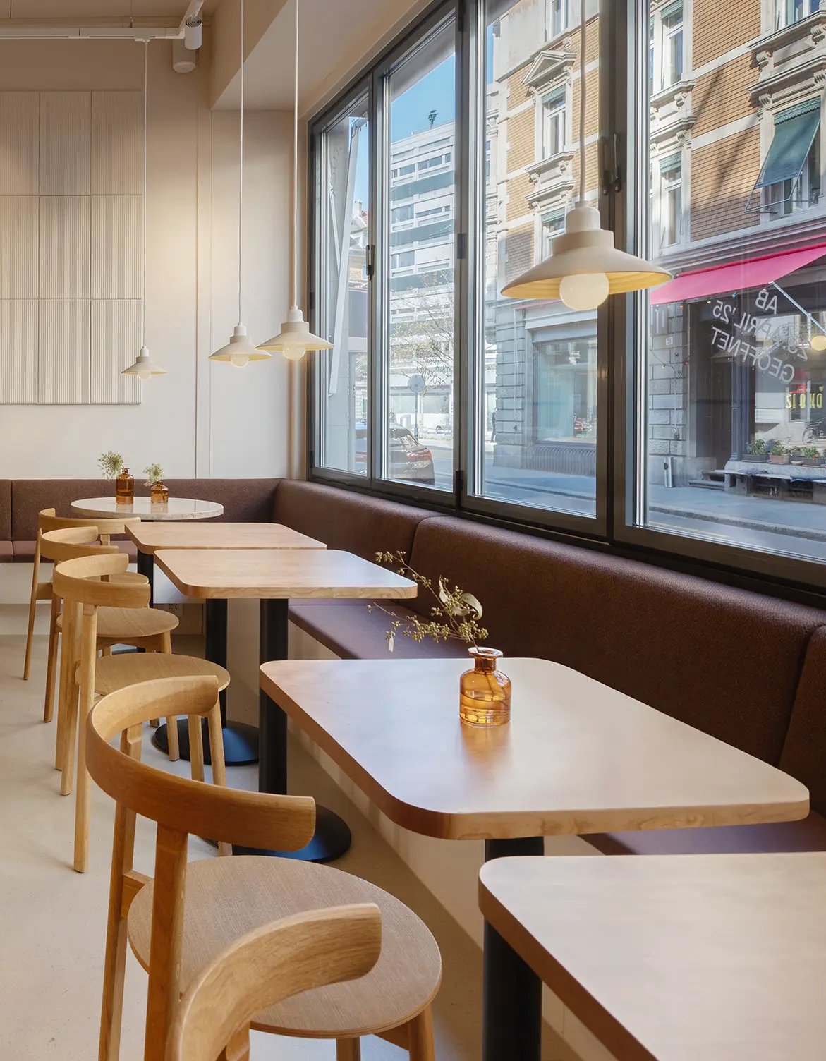 Pfeffermint AG har designet det nye interiør i Café Irma med stor opmærksomhed på detaljerne – et sted, hvor ægte håndværk er i fokus. Naturlige materialer og rolige naturfarver præger rummet og lader brød og produkter være i centrum. Håndlavede keramiklamper, akustiske elementer af presset bomuld, varmt kirsebærtræ og Form & Refine Lunar Chair af massivt egetræ, som har samme farve som et sprødt brød, skaber en rolig og autentisk atmosfære.