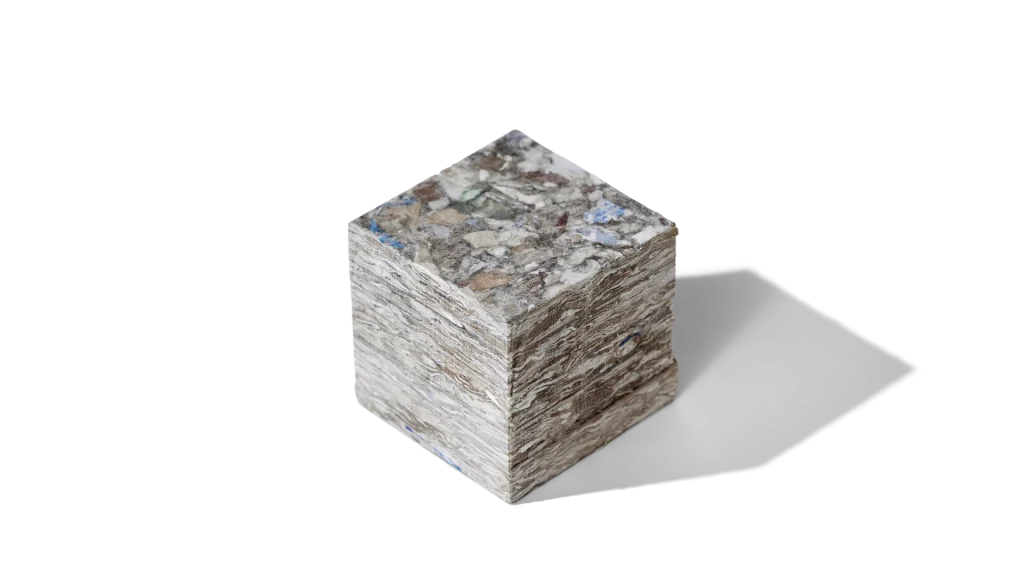 Til vores Remake-kollektion bruger vi et plademateriale fremstillet af genanvendt emballageaffald, kaldet Recoma Packwall Design Board, produceret i Europa. Materialet fremstilles gennem en patenteret proces, hvor emballagen komprimeres under varme og tryk – uden brug af bindemidler eller klæbestoffer.