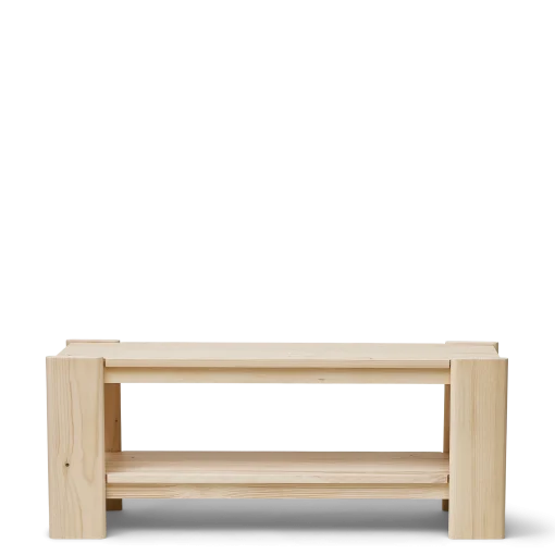En smart og robust bænk i træ til stort set alle hjemmemiljøer med en lang praktisk underhylde til opbevaring af hverdagens ting og sager. De markante H-formede gavle, som fremhæver fyrretræets smukke åretegning, favner siddefladen, der ligesom resten af møblet er fremstillet af massivt fyrretræ.