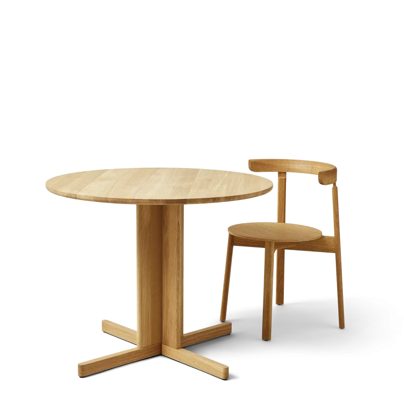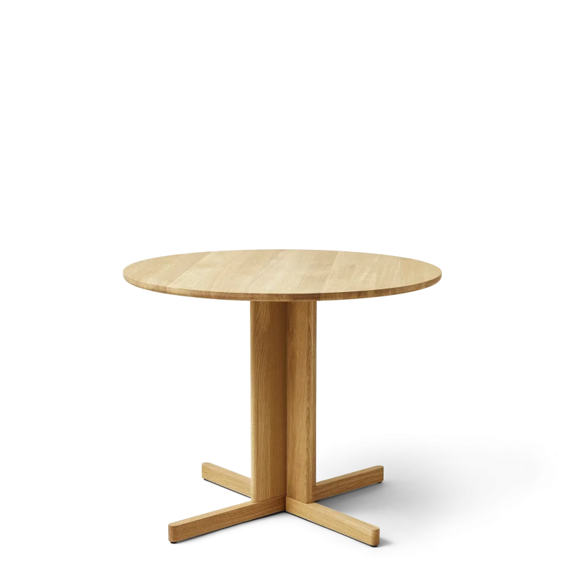 En centreret søjle af elegante ben i massivt egetræ bærer det kvadratiske bord i en raffineret kontrast mellem lethed og tyngde. De små åbninger mellem søjlens fire elementer bidrager til træbordets elegante formsprog og visuelle kompleksitet. Den midtstillede søjle giver god benplads til alle rundt om bordet, som er lige anvendeligt i hjemmet som i offentlige miljøer.