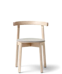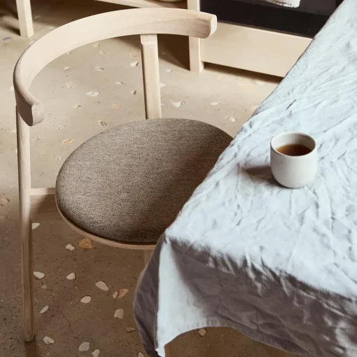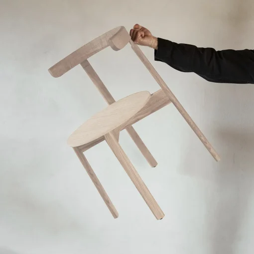 En centreret søjle af elegante ben i massivt egetræ bærer det kvadratiske bord i en raffineret kontrast mellem lethed og tyngde. De små åbninger mellem søjlens fire elementer bidrager til træbordets elegante formsprog og visuelle kompleksitet. Den midtstillede søjle giver god benplads til alle rundt om bordet, som er lige anvendeligt i hjemmet som i offentlige miljøer.
