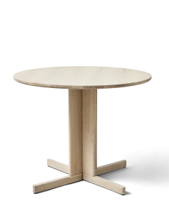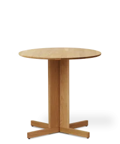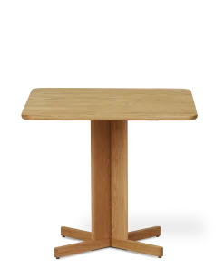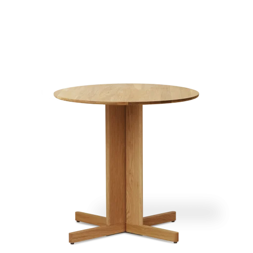Et midtpunkt af frit svævende massive egetræselementer fungerer som fundament for bordet, der fås i både runde og firkantede modeller. Dette design skaber en slående balance mellem en følelse af lethed og bordpladens solide, substantielle karakter. Den frie plads mellem benene forstærker bordets luftige æstetik og bidrager til dets visuelt spændende kompleksitet.