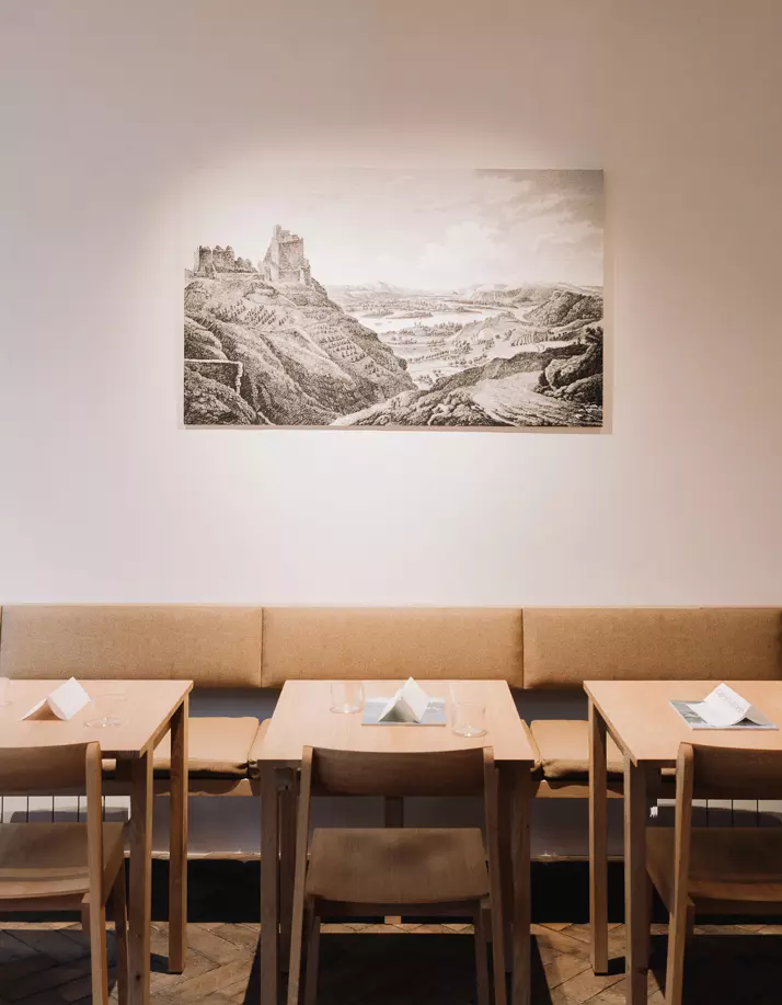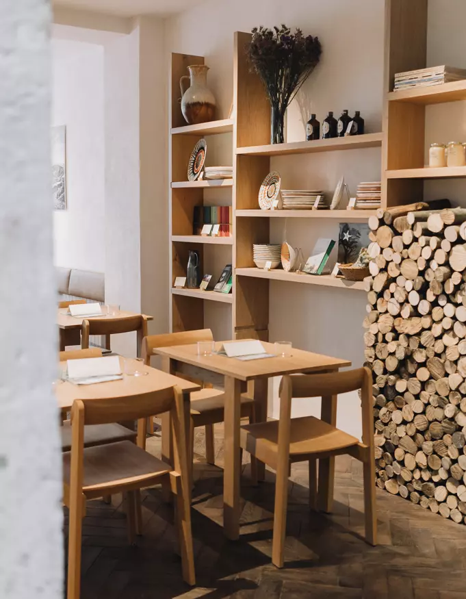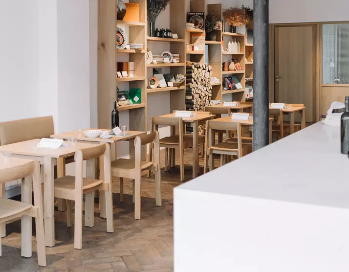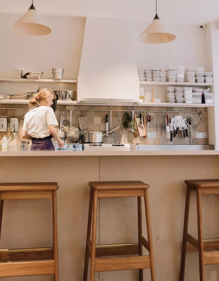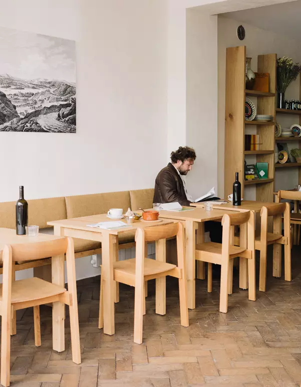 Camille Besse, die Innenarchitektin, kombiniert den Blueprint Chair und den Angle Bar Stool mit Tischen und weiteren Möbeln aus Eiche, die sie selbst entworfen und hergestellt hat.