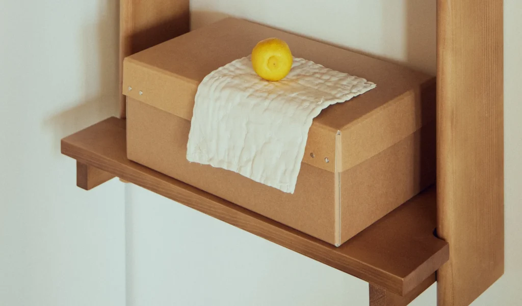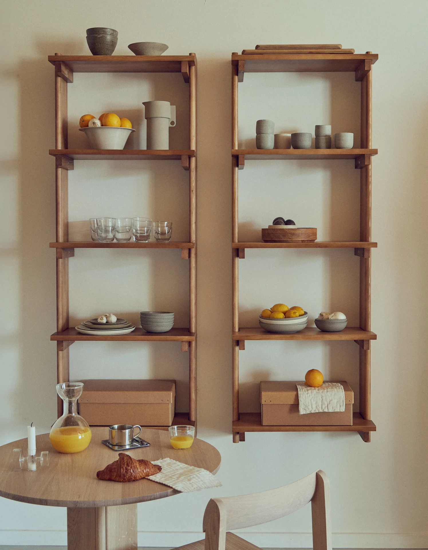 ”Die Inspiration für das Beam Shelf kam aus der Architektur und dem Bauwesen. Die breiten Seitenrahmen umarmen und tragen die Regale, was durch die abgerundeten Details jedes Regals unterstrichen wird.”