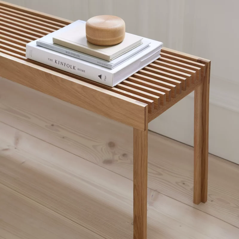 ”Die Idee entstand, als wir uns intensiver mit dem Thema ‘Konstruktionen’ beschäftigten, ins besondere der Frage, wie man mit dünnen Platten ein hohes Maß an Festigkeit erreichen kann. Verschiedene Versuche führten zu der Montagemethode, bei der dünne Sperrholzplatten in Massivholz gefräst werden, um neben der Konstruktion auch ein schönes Design zu kreieren. Die abgerundete Kante, die jedes Bein abschließt, verleiht dem Möbelstück einen eleganten und leichten Charakter.”
