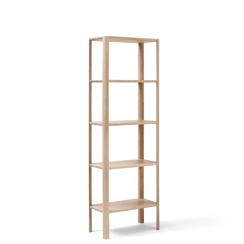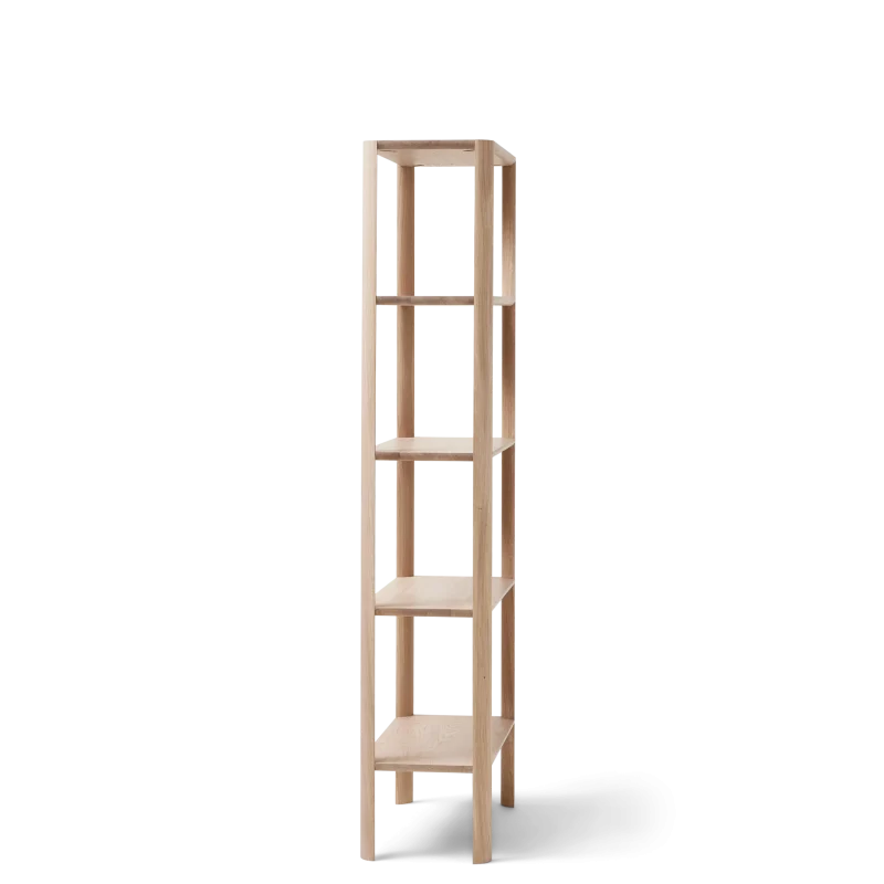 Das Leaf Shelf ist der Versuch, ein Regalsystem zu schaffen, das Ästhetik, Stabilität und Füllraum optimal vereint. Es zeichnet sich durch eine sehr schlichte Ästhetik aus, die darauf abzielt, dass die Regalbeine im Zentrum der Aufmerksamkeit stehen. Mit ihrem organischen und klaren Ausdruck in Form eines Blattes verleihen sie dem System sein charakteristisches Aussehen. Die Konstruktion selbst ist auch in puncto Stabilität bahnbrechend, da sie komplett ohne sichtbare Schrauben oder zusätzliche Stabilisierungsteile am Regal auskommt.
