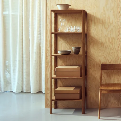 ”Ich finde flache Regale ohne Rückwand praktisch, aber oftmals fehlt es ihnen an Ästhetik oder Stabilität. Das Leaf Shelf ist mein Versuch, ein Regalsystem zu kreieren, das geschmackvoll aussieht, stabil ist und genügend Stauraum bietet. Ich möchte das Regalsystem in vielen unterschiedlichen Höhen und Breiten anbieten, damit es in viele verschiedene private und geschäftliche Räume passt ”