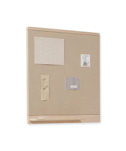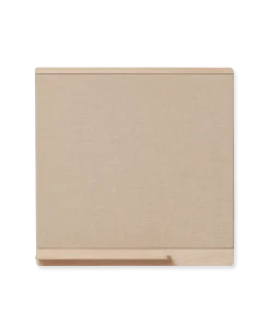 ”Wir wollten eine Pinwannd mit einer schmalen Ablage machen – ein Detail, das oft bei dieser Art von Gegenstand fehlt, aber nützlich ist, um kleine Sachen wie Nadeln oder Stifte abzulegen. Wir haben einen Stoff ausgesucht, der die Wärme aufgreift, die das Eichenholz ausstrahlt, um damit einen warmen und weichen Look zu erzeugen. Der Holzrahmen auf der Rückseite ist etwas dicker, was die Pinnwand von der Wand abhebt und für einen leichten Schatten an der Wand sorgt”