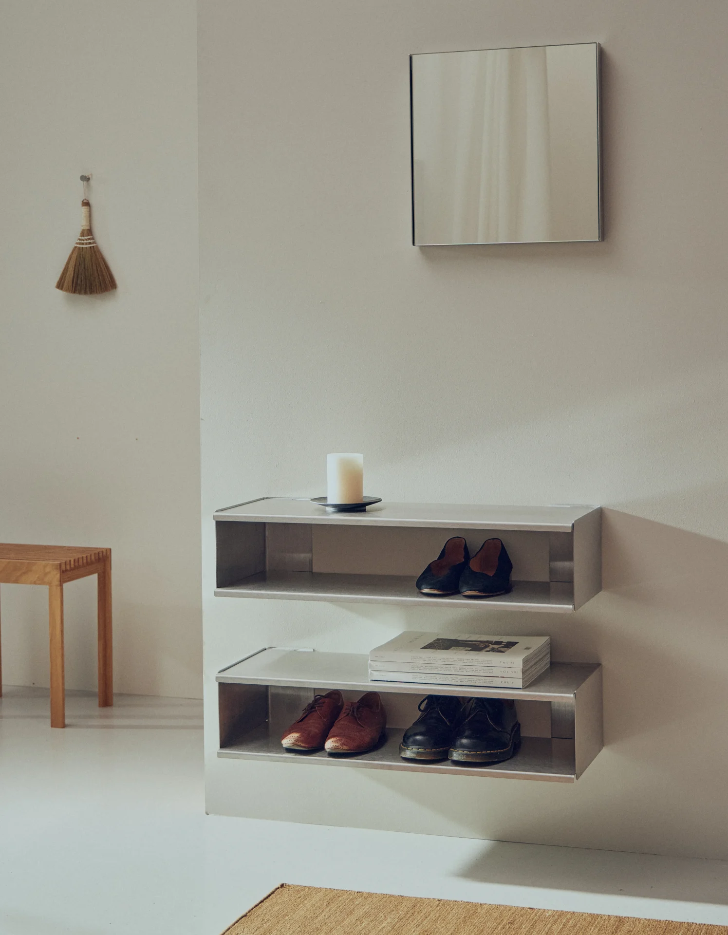 Dieses raffinierte und vielseitige Stahlregal wurde für das urbane Wohnen entworfen und bietet mehrere Funktionen – als Konsole im Flur, als schmales Ausstellungsregal oder als stilvolle Aufbewahrungsmöglichkeit für Alltagsgegenstände und Schuhe.