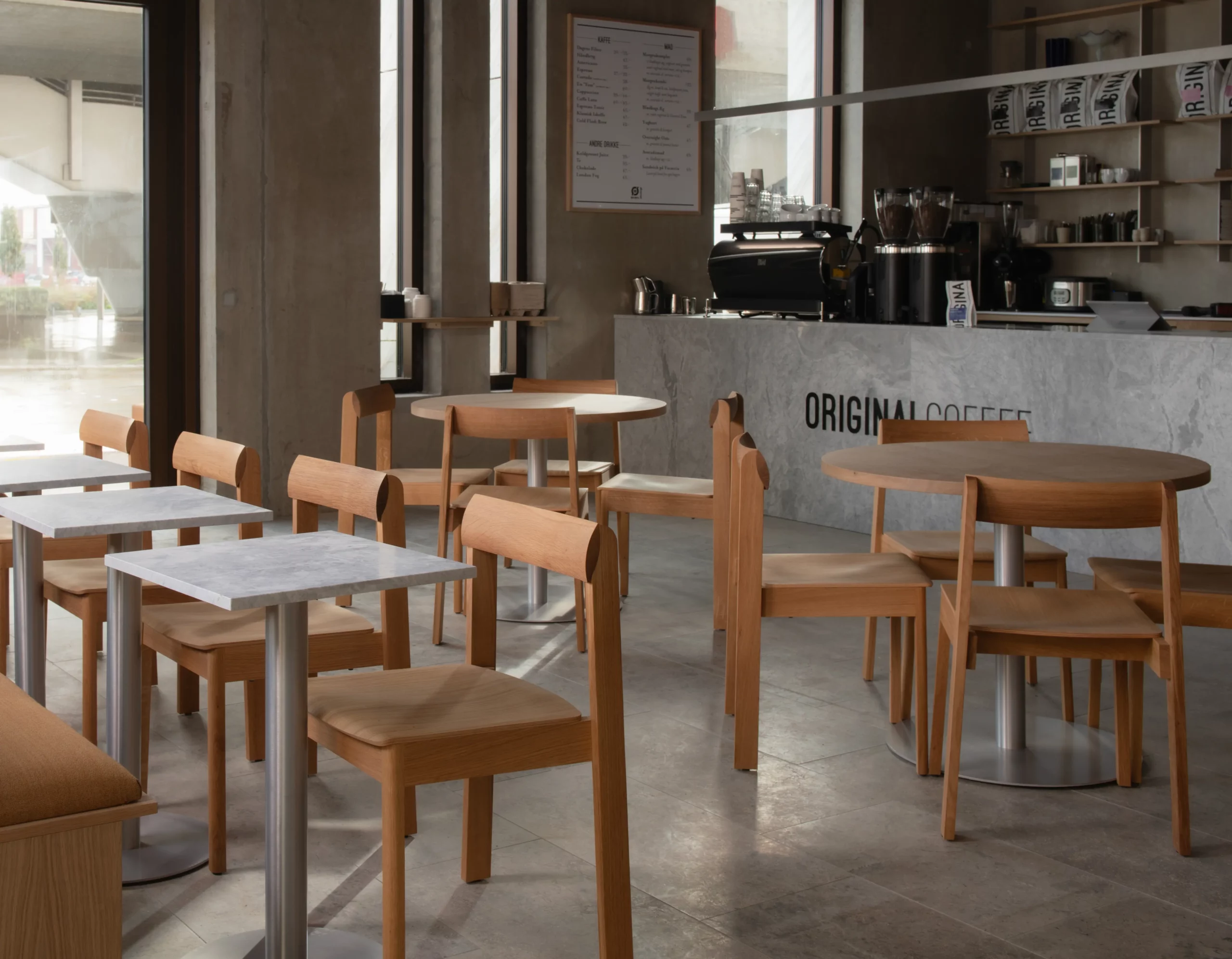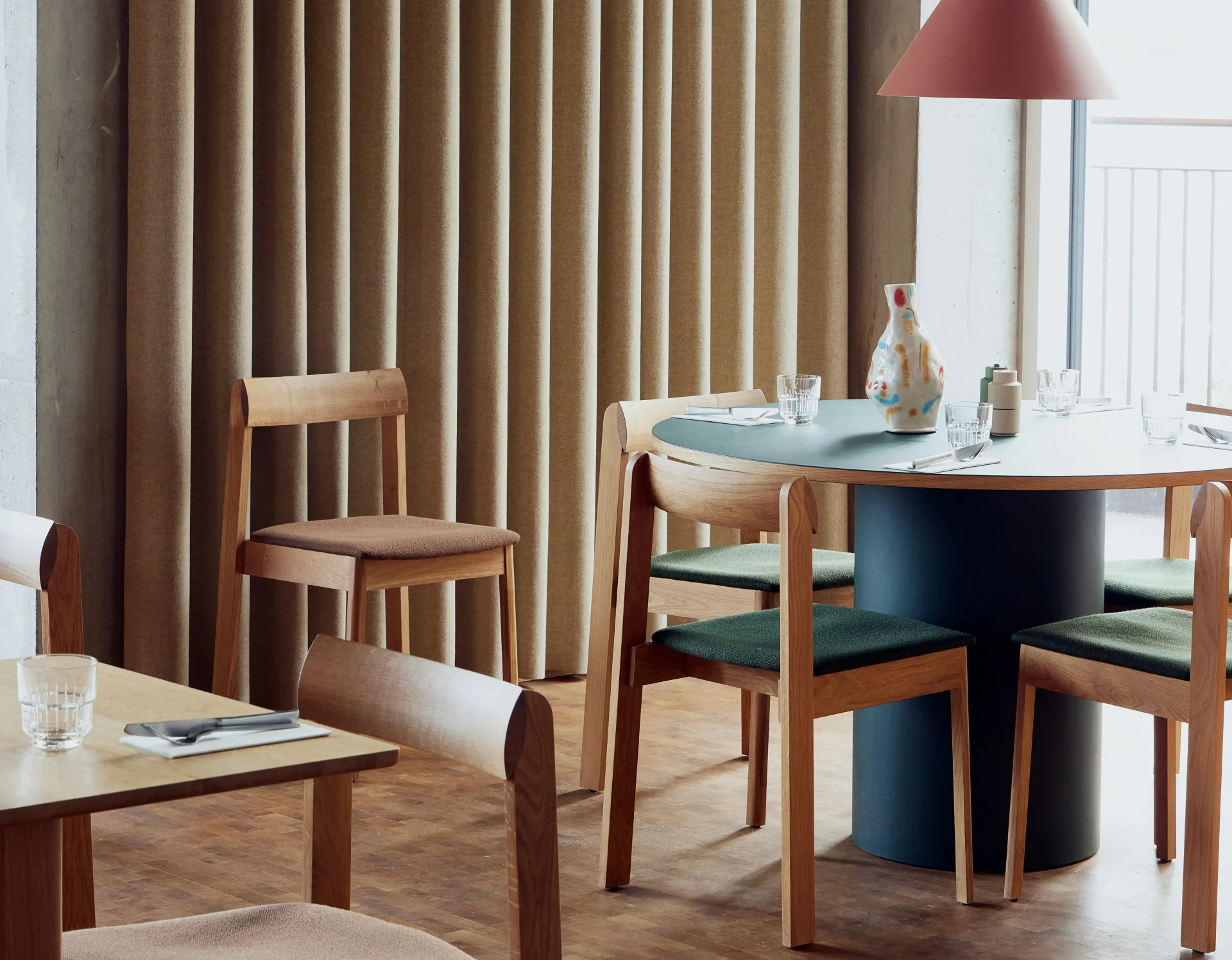 Pfeffermint AG has designed the new interior of Café Irma with great attention to detail – a place where genuine craftsmanship takes focus. Natural materials and calm natural colours characterise the space and allow bread and products to take centre stage. Handmade ceramic lamps, acoustic elements made of pressed cotton, warm cherry wood and the Form & Refine Lunar Chair made purely of solid oak, which echoes the colour of a crispy bread, create a calm and authentic atmosphere.