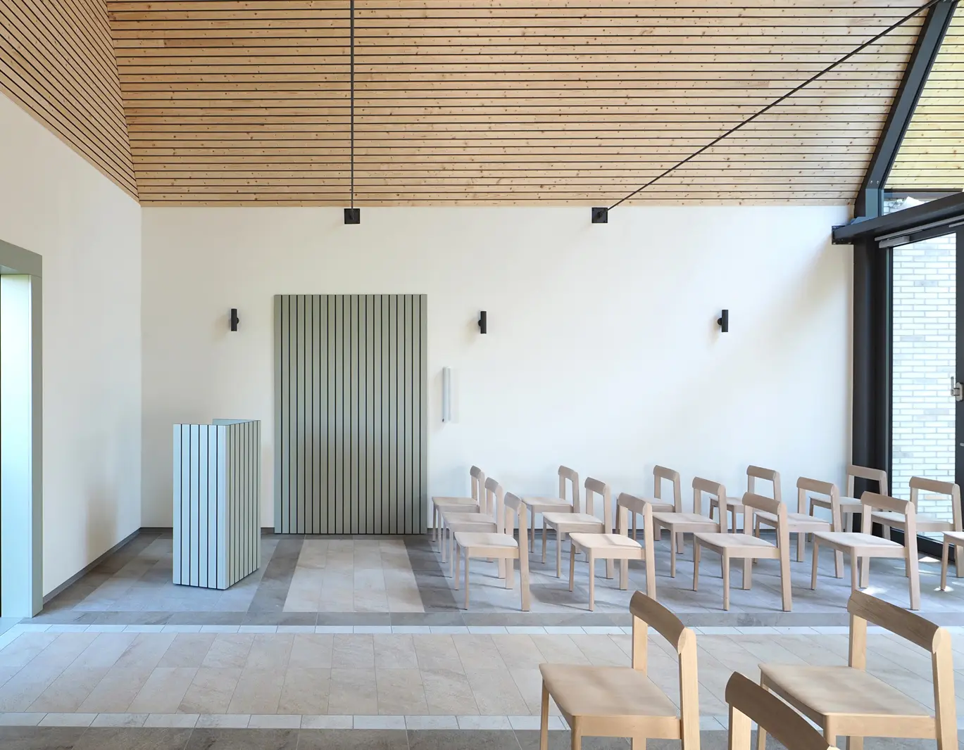 The cemetery chapel in Walbeck has undergone extensive renovations, making it brighter, larger and more modern. The work was completed in spring 2025. The modernisation measures mainly affected the central part of the hall, which was built in the 1950s. The two extensions on the left and right were completed in the late 1980s. These were also modernised with large window panels and bespoke furniture made from pure white oak by Form & Refine.