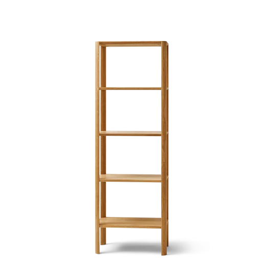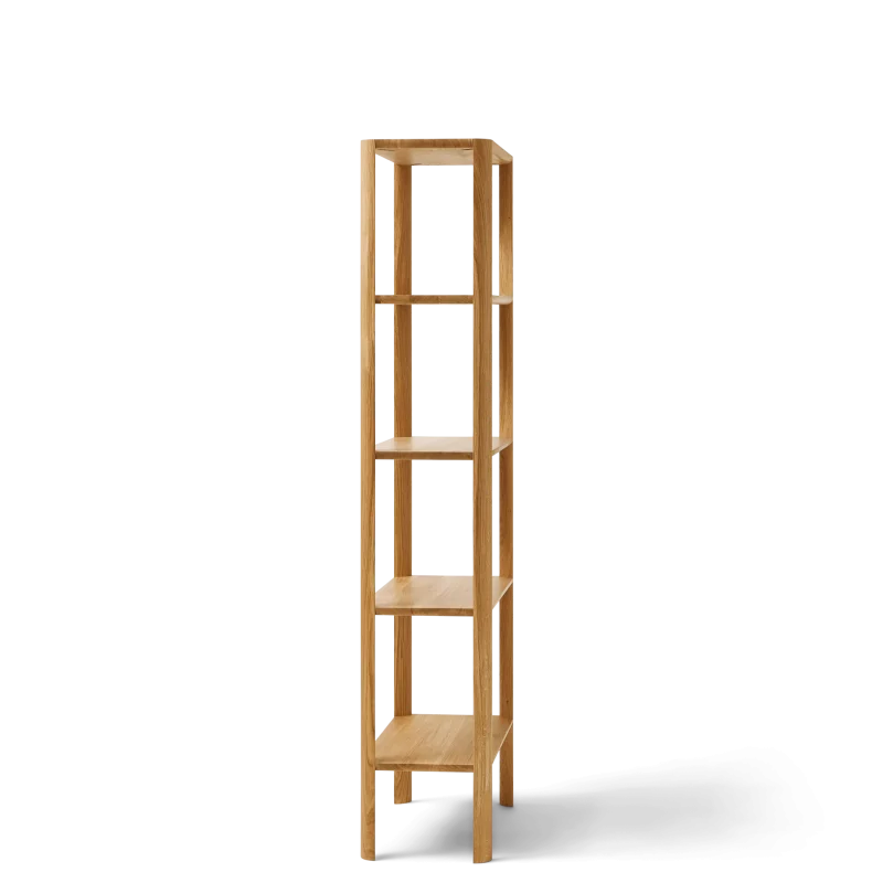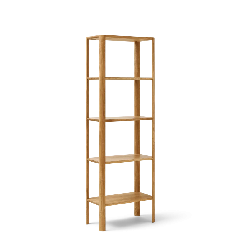 The Leaf Shelf is an attempt to create a shelving system that strikes the ultimate balance between aesthetic, stability and packability. It is characterised by a very pure aesthetic that aims to make the column legs the centre of attention. With an organic and clean expression, sculpted in the shape of a leaf, they give the system its signature look. The construction itself is also ground-breaking in terms of stability, as it is entirely contained, without any visible screws or other stabilising parts under the shelf.