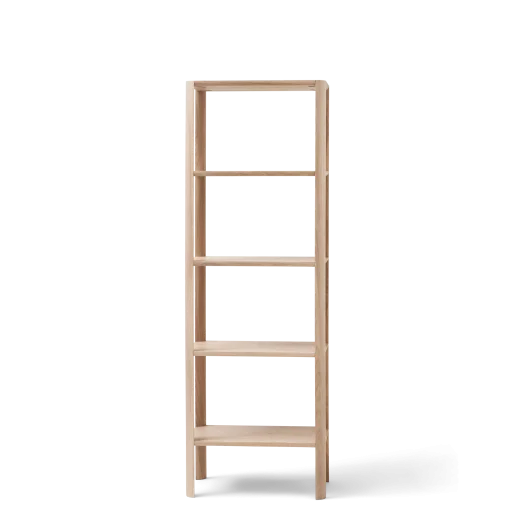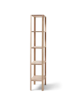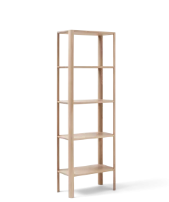 The Leaf Shelf is an attempt to create a shelving system that strikes the ulti- mate balance between aesthetics, stability and packability. It is characterised by a very pure aesthetic, the aim being that the leg pillars are the centre of attention. With an organic and clean expression, sculpted in the shape of a leaf, they give the system its signature look. The construction itself is also bre- aking ground in terms of stability, as it is entirely contained without any visible screws or extra stabilising parts underneath the shelf.