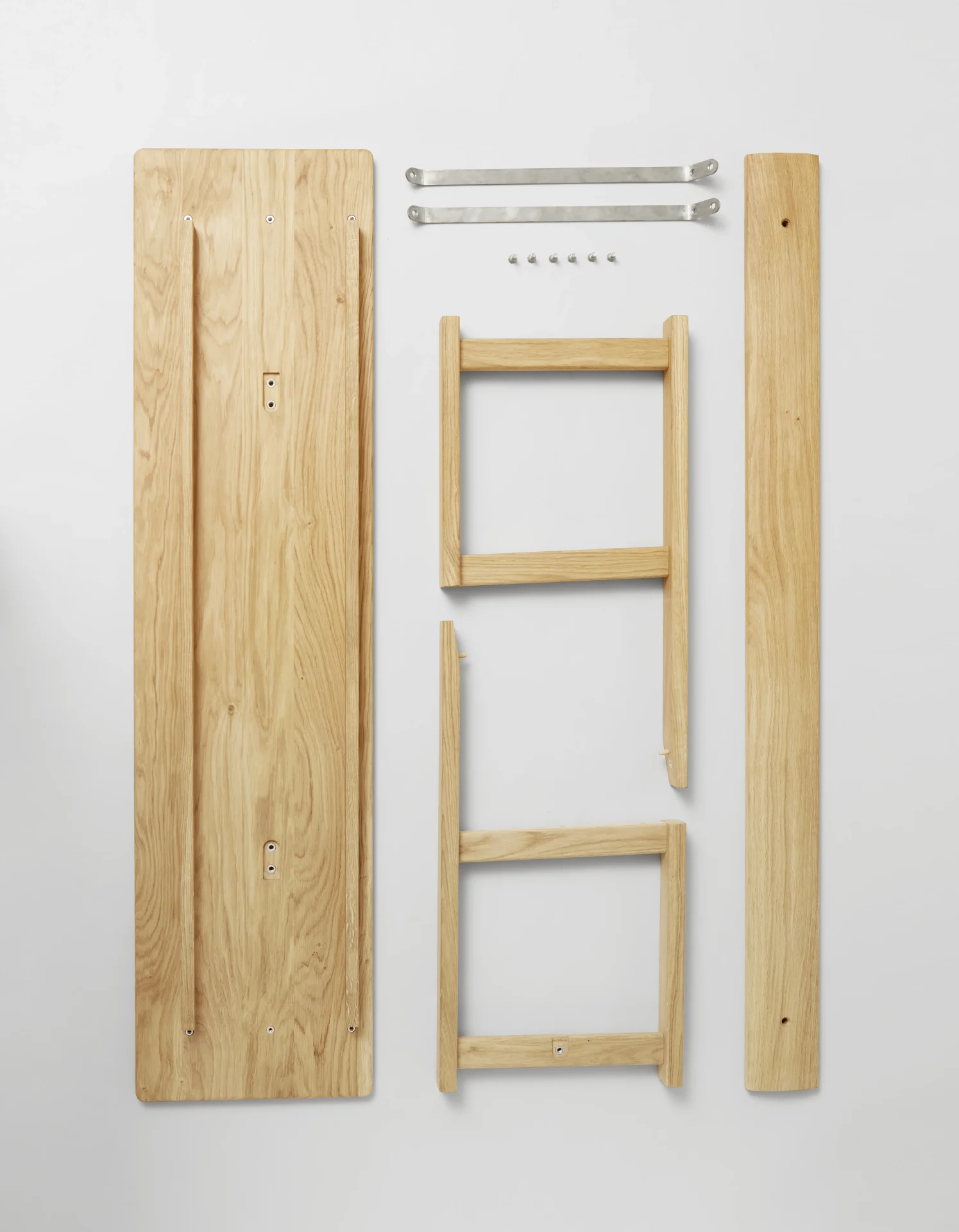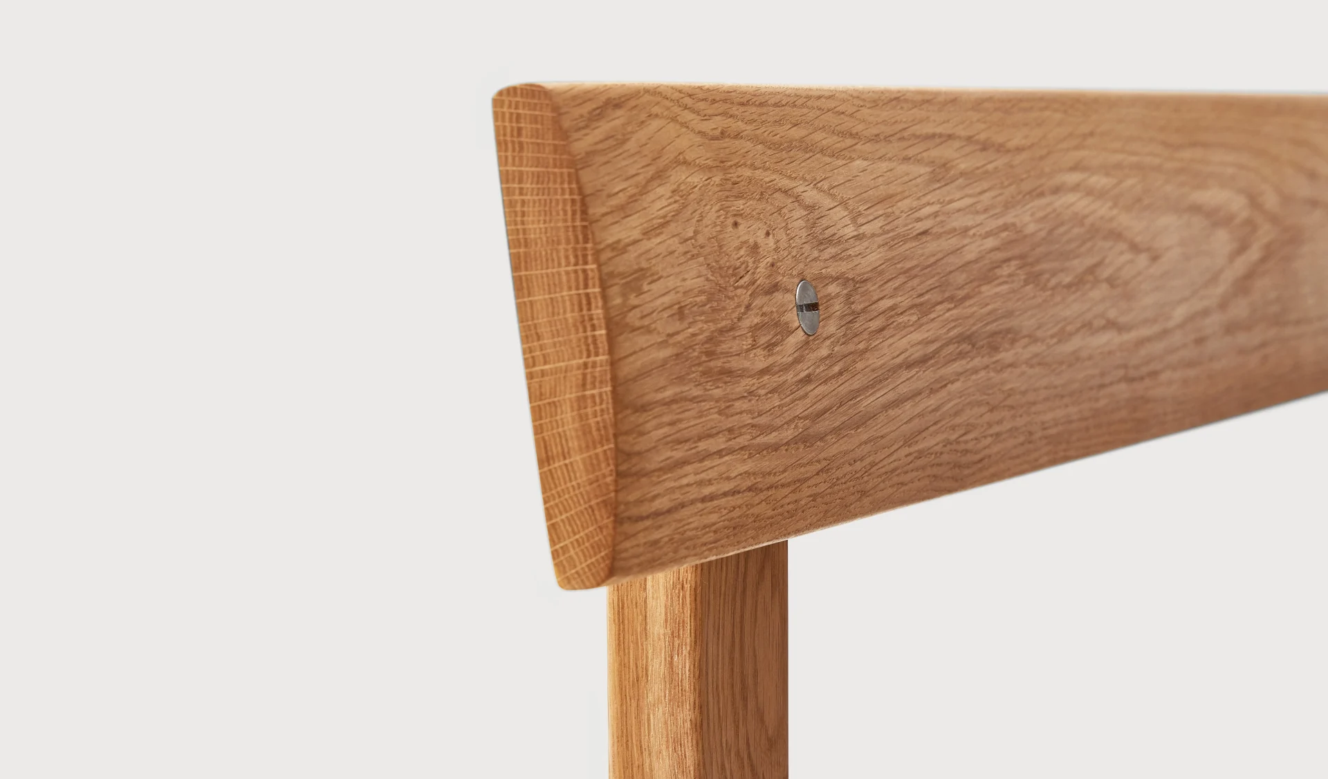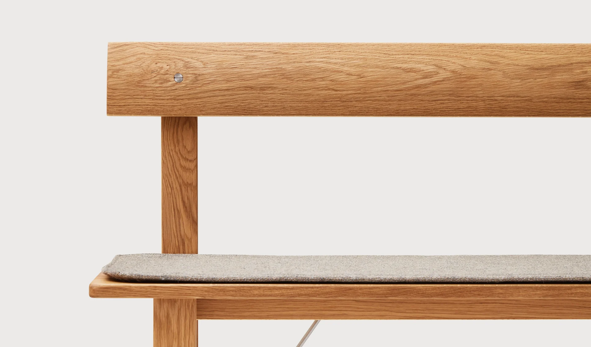 The Position Bench has a clear and eye-catching silhouette with straight horizontal and vertical lines. The contrast to the natural, solid oak gives the bench an appealing warmth and clear expression. The minimalist backrest with its moderate angle adds extra comfort. The steel detailing underneath shows the care and craftsmanship taken to create this sophisticated piece
