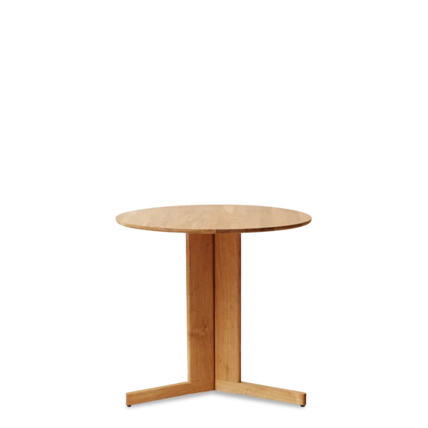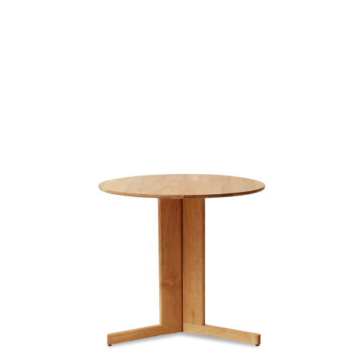 A centre point of free-floating solid oak elements hold the round table in place, creating a contradiction of lightness and substantiality. The free space of the three legs adds to the lightness and special visual complexity of the table. The three legs make it possible to sit around the table in comfort with much more space for each user.